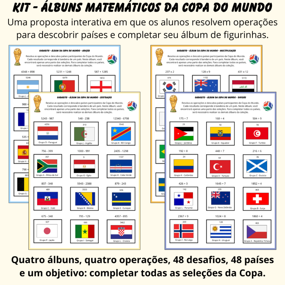 Neste material, os alunos resolvem operações matemáticas para descobrir países participantes da Copa do Mundo e completar um álbum de figurinhas. A cada resultado correto, uma nova seleção é revelada, tornando a aprendizagem mais dinâmica, motivadora e com propósito.