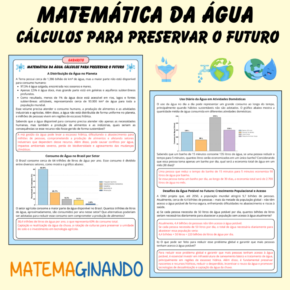 Explore conceitos matemáticos essenciais aplicados à crise hídrica global com o material Matemática da Água! Este recurso educativo combina problemas matemáticos, gráficos e reflexões sobre o consumo e a preservação da água, incentivando o pensamento crítico e a conscientização ambiental.