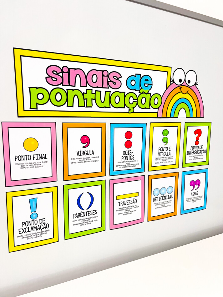 O painel organiza os principais sinais de pontuação de forma clara e acessível, apresentando cada um com explicação simples e exemplos práticos, facilitando a compreensão dos alunos.